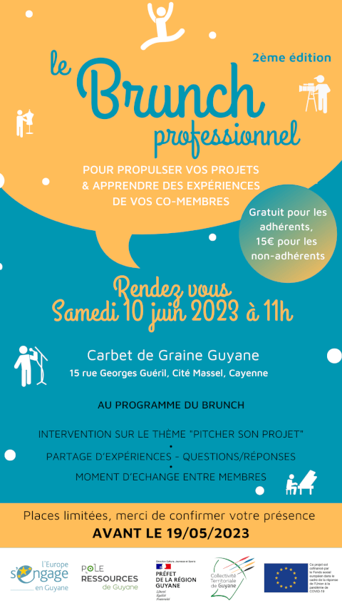 Le Pôle Ressources de Guyane organise la 2ème édition de son Brunch Professionnel le 10/06/2023 Un moment d’échange et de partage à ne pas rater ! Au programme de cette édition : Partages d’expériences, intervention sur la thématique « Pitcher son projet », les experts du Pôle seront également présents pour répondre à toutes vos questions !