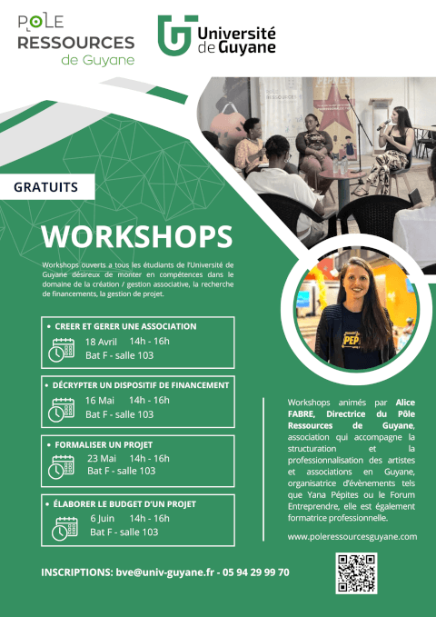 Le Pôle Ressources de Guyane en partenariat avec l'Université de Guyane propose 4 workshops à destination des étudiants souhaitant monter en compétences dans le domaine de la gestion de projet/associative